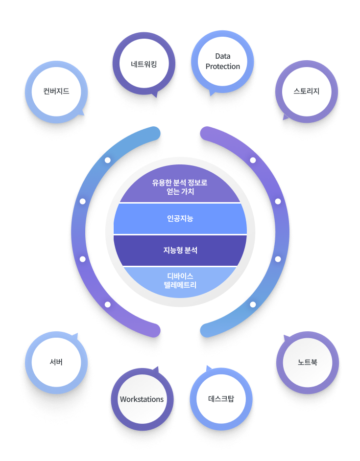 지금 이 순간에도 Dell은 7,000만 개 이상의 디바이스에 연결되어 있으며 이 숫자는 계속 증가하고 있습니다. Dell의 인공 지능 기반 연결 기술은 매년 350만 건 이상의 문제들 예속하고 6,500억 건 이 넘는 분석 규칙을 실행하여 하드웨어와 소프트웨어 최적화를 위한 솔루션을 처방하며 매일 고객이 필요한 것과 기술이 어떤 성과를 내고 있는지의 질문에 답변합니다.